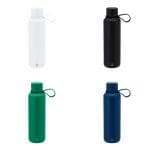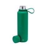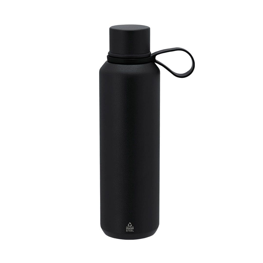 Bidón térmico de 630 ml de capacidad, fabricado en Acero Inox Reciclado de doble pared. Incluye asa de silicona a juego. Libre de BPA. Con distintivo acero inoxidable reciclado.