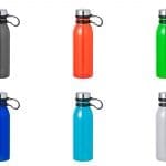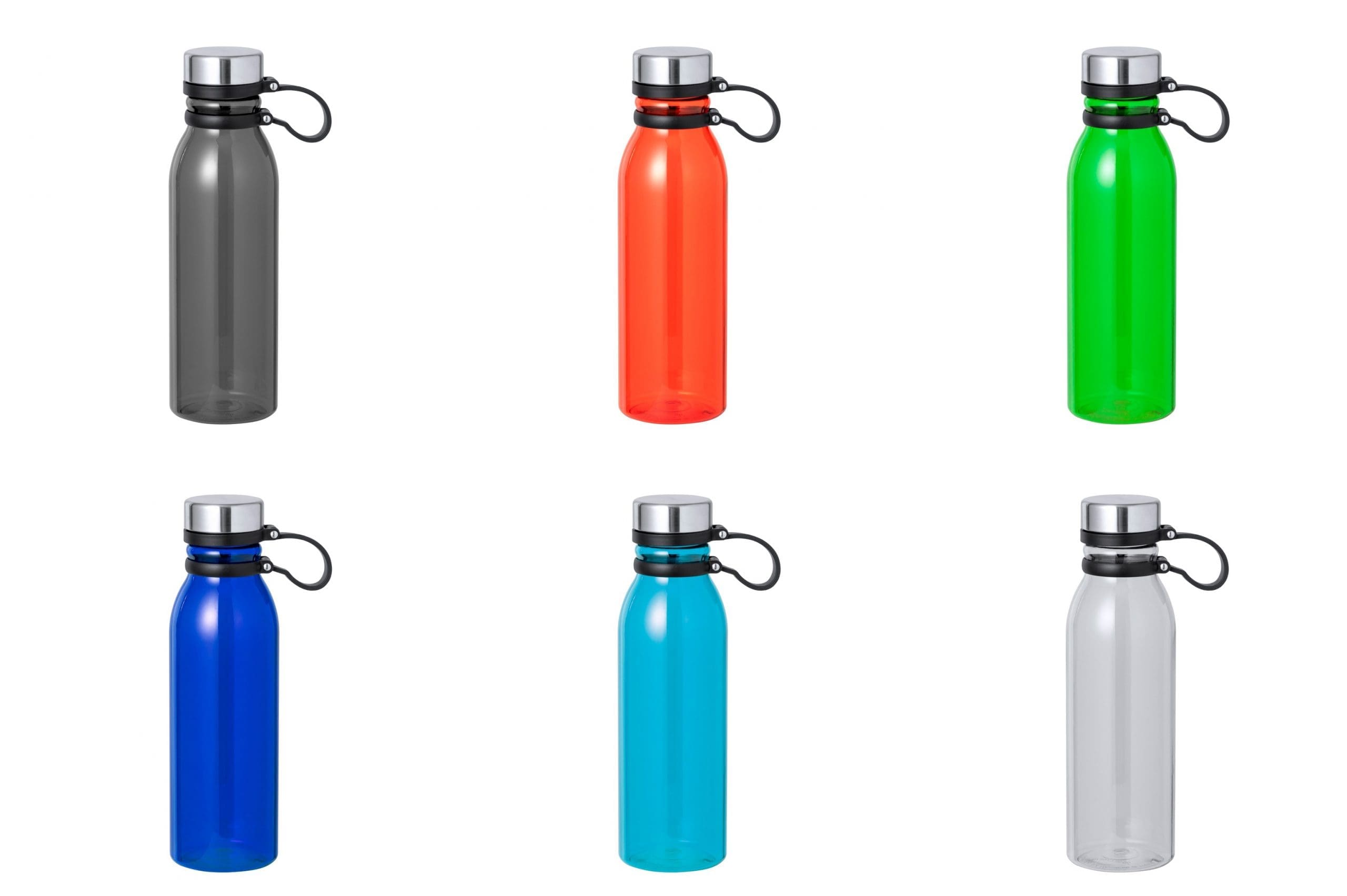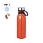 Bidón en RPET de 830 ml de capacidad. Tapón de seguridad de rosca en acero inox y original cinta de silicona para un fácil transporte. Disponible en variada gama de colores translúcidos. Libre de BPA y presentado en atractiva caja de diseño kraft.