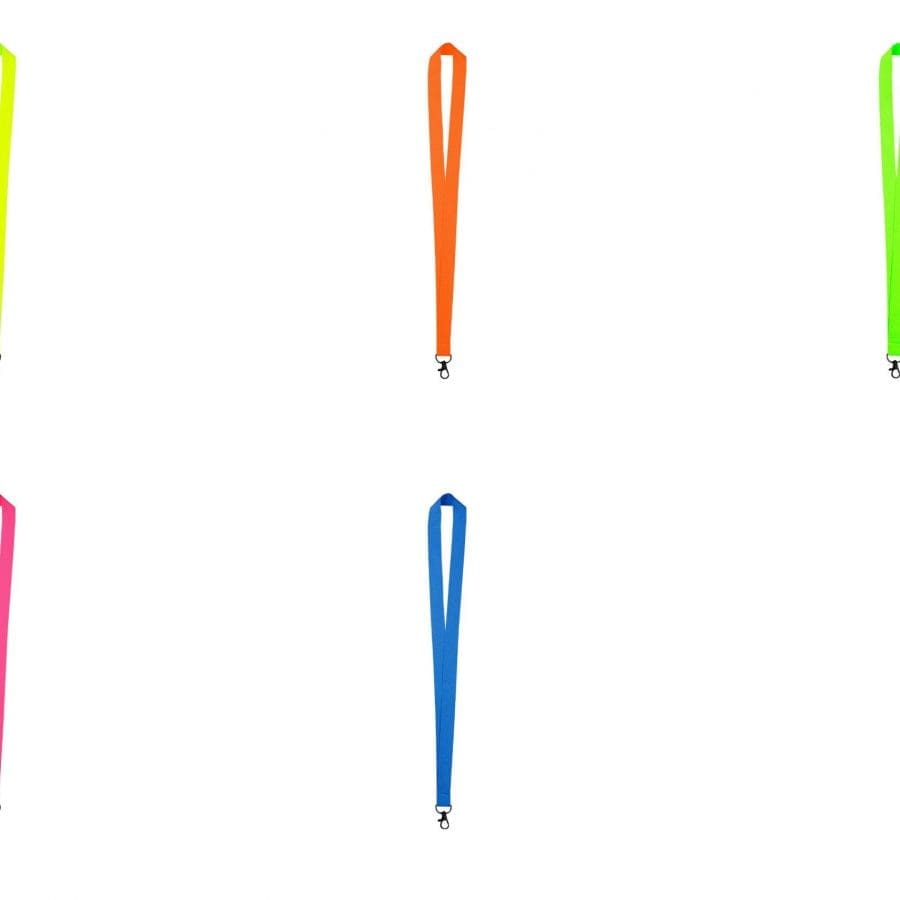 Lanyard en colores flúor. Confeccionado en resistente poliéster, equipado con un gancho metálico giratorio para mayor funcionalidad.