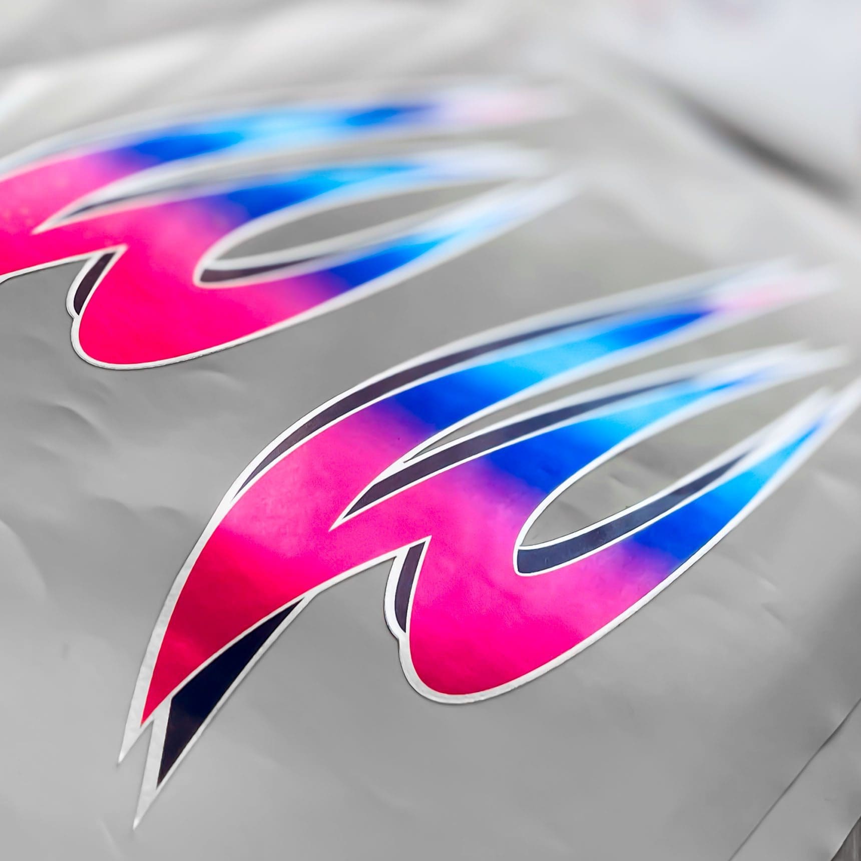 Estas pegatinas se imprimen en una lámina transparente sobre un vinilo con fondo efecto espejo. Los colores transparentan con el fondo y se ven afectados por el color del vinilo espejo de la parte inferior, consiguiendo así ese toque especial tan llamativo.