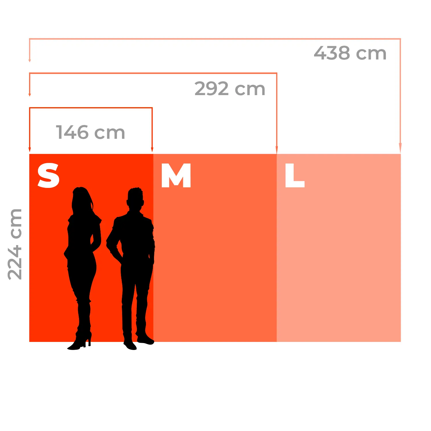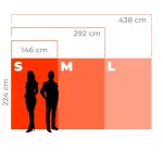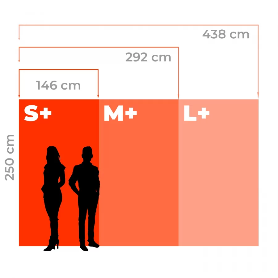 (S) 146 x 224 cm, (S+) 146 x 250 cm, (M) 292 x 224 cm, (M+) 292 x 250 cm, (L) 438 x 224 cm, (L+) 438 x 250 cm