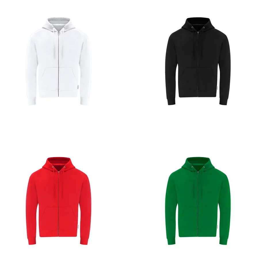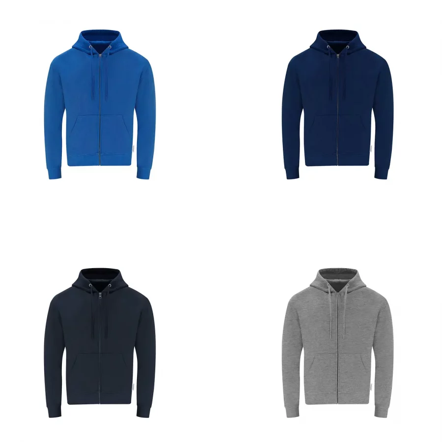 Sudadera Unisex con capucha y cremallera de Algodón Orgánico y Poliéster Reciclado, en suave felpa perchada de 280 g/m2. Con capucha forrada de doble capa, cordones redondos ajustables -con topes a juego- y ojales metálicos. Puños y cintura de punto canalé de elastano y bolsillo frontal tipo canguro. Apertura de cremallera oculta metálica, con cubrecosturas reforzado en cuello. Incluye etiqueta distintiva eco.